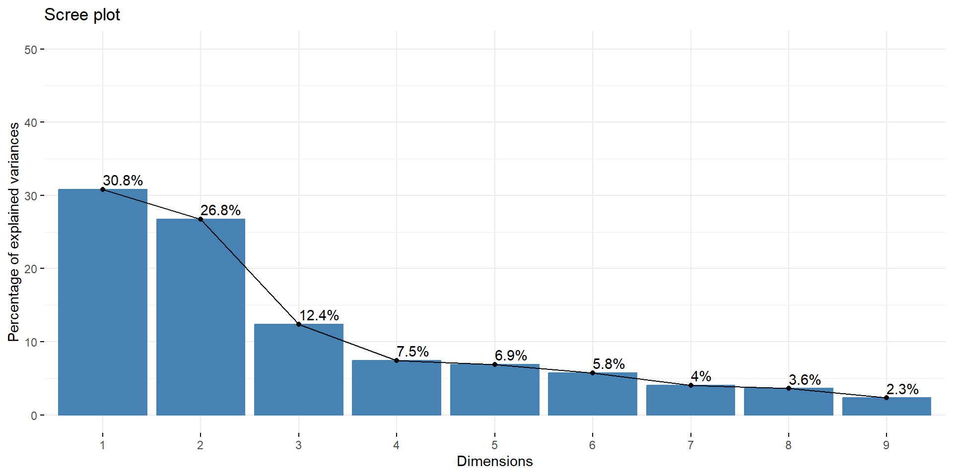 If we calculate a PCA on the impulsivity data, we see that there are two components (in the scree plot) that account for quite some variance.