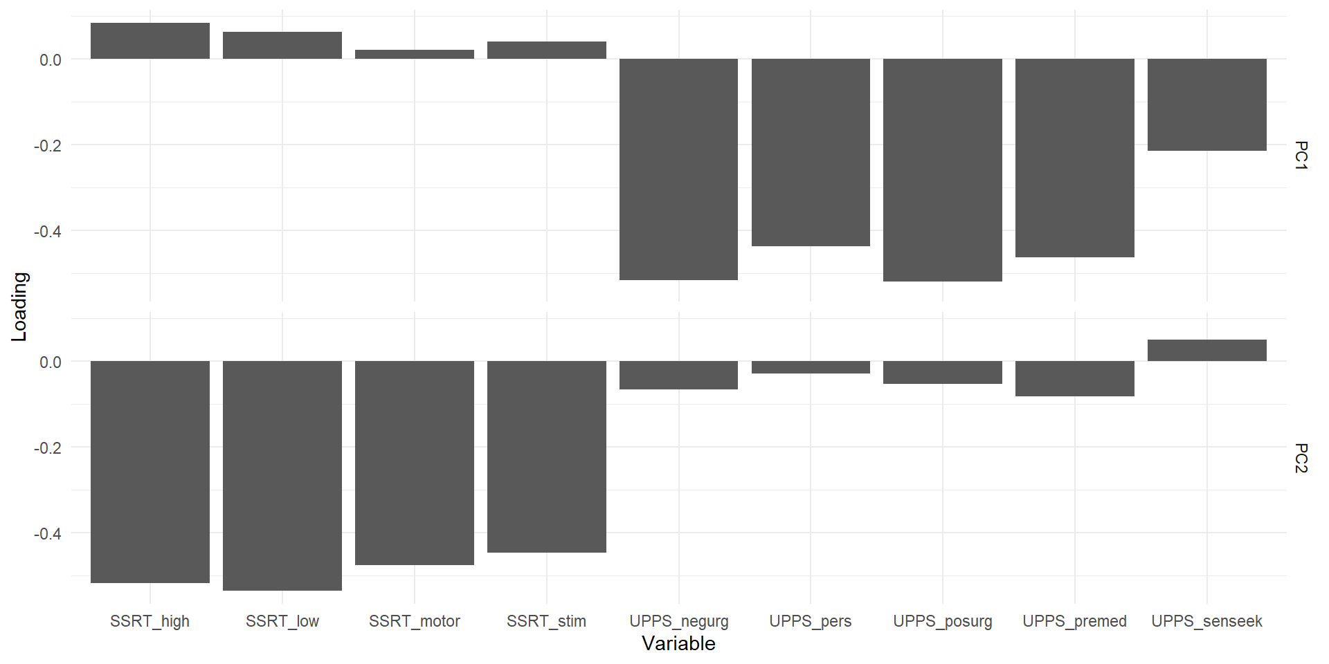 We can also look at the variable loadings, which show which variable “goes into” which component to better specify what that component represents. Here we can see that one components represents (=captures variance related to) the SSRT variables, the other the UPPS.