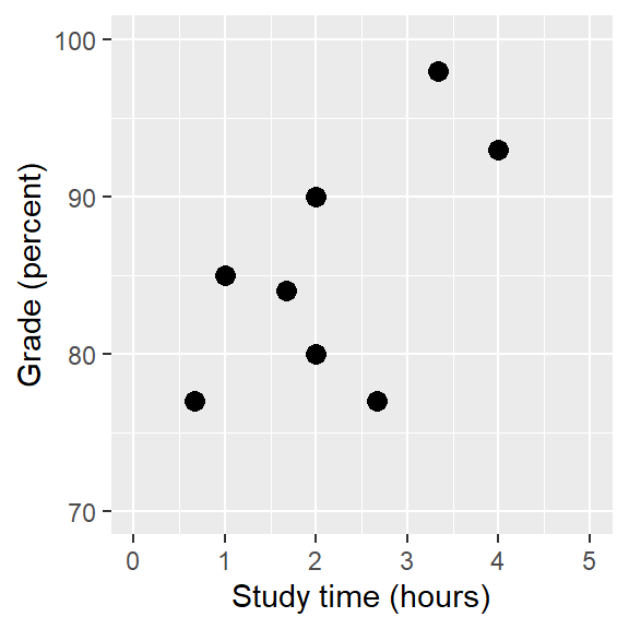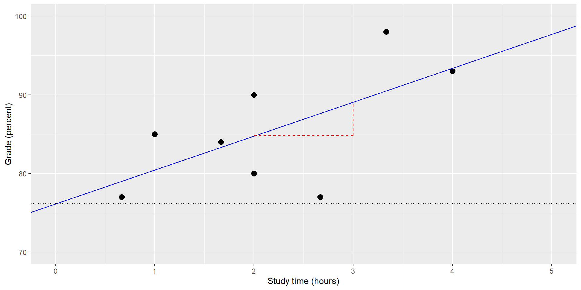 In study time example, \(R^2\) = 0.63² = 0.4 –> we accounted for 40% of the overall variance in grades!