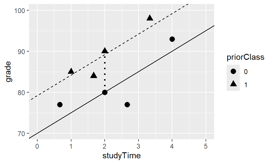 priorClass, i.e. whether each individual has taken a previous class or not, we use dummy coding (0=no, 1=yes).studyTime across data points/regardless of whether someone has taken a class before.If we plot the data, we can see that both IVs seem to have an effect on grades:
