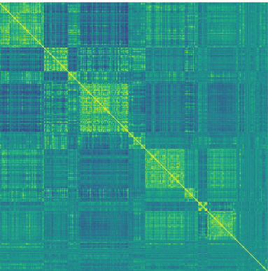 Heatmap of correlation coefficients of brain activity between 316 regions of the left hemisphere of a single individual. Yellow: strong positive correlations, blue: strong negative correlations
