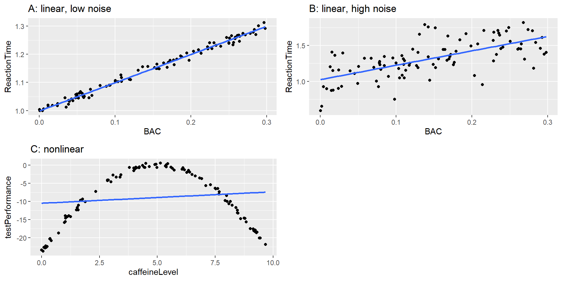 Simulated relationship between blood alcohol content and reaction time on a driving test, with best-fitting linear model represented by the line. A: linear relationship with low measurement error. B: linear relationship with higher measurement error. C: Nonlinear relationship with low measurement error and (incorrect) linear model
