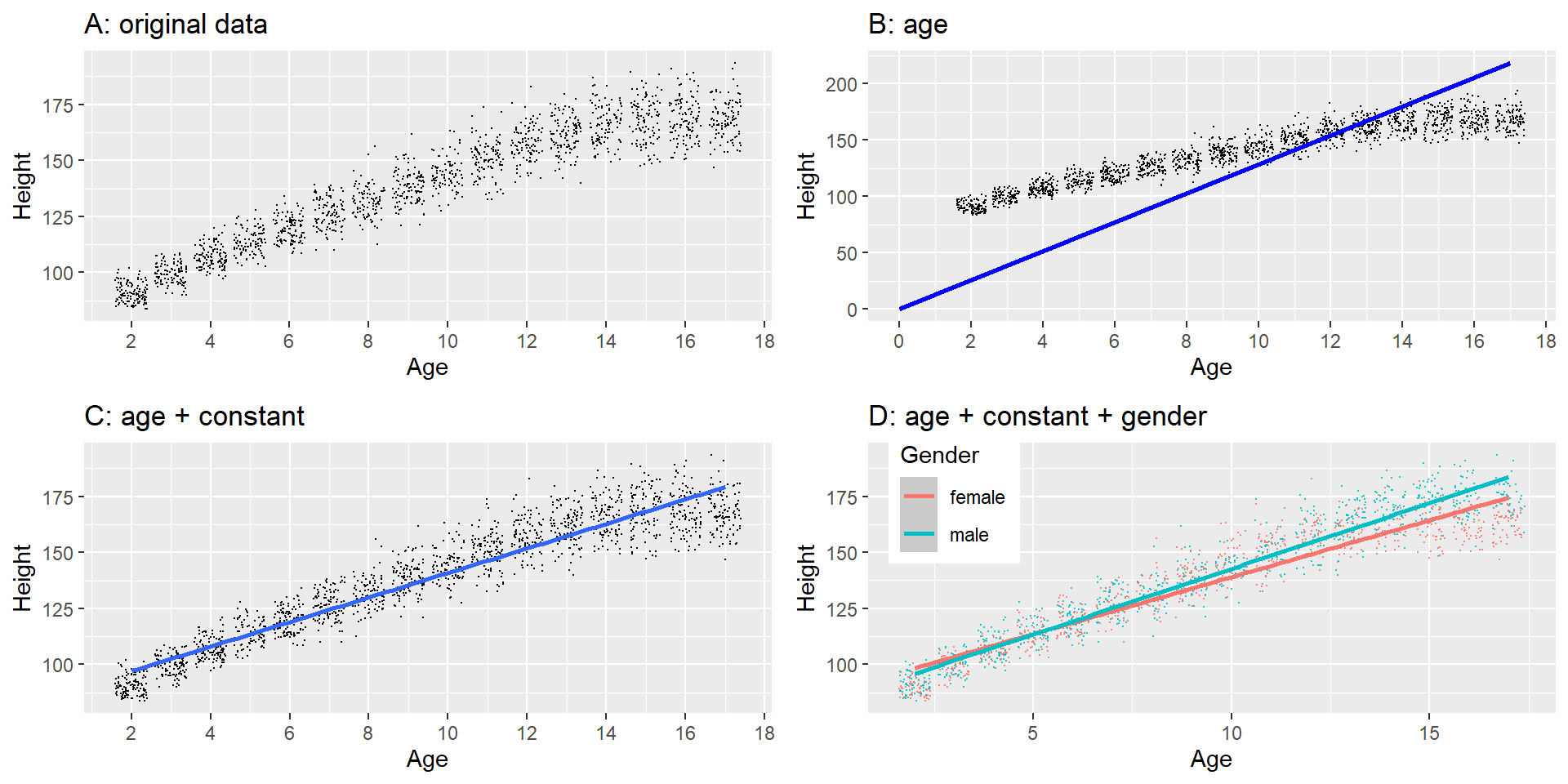 As we can see, the line (~ model) fits the data points increasingly well, e.g. if we include a constant (also called “intercept”) and age. We would write this as this formula: