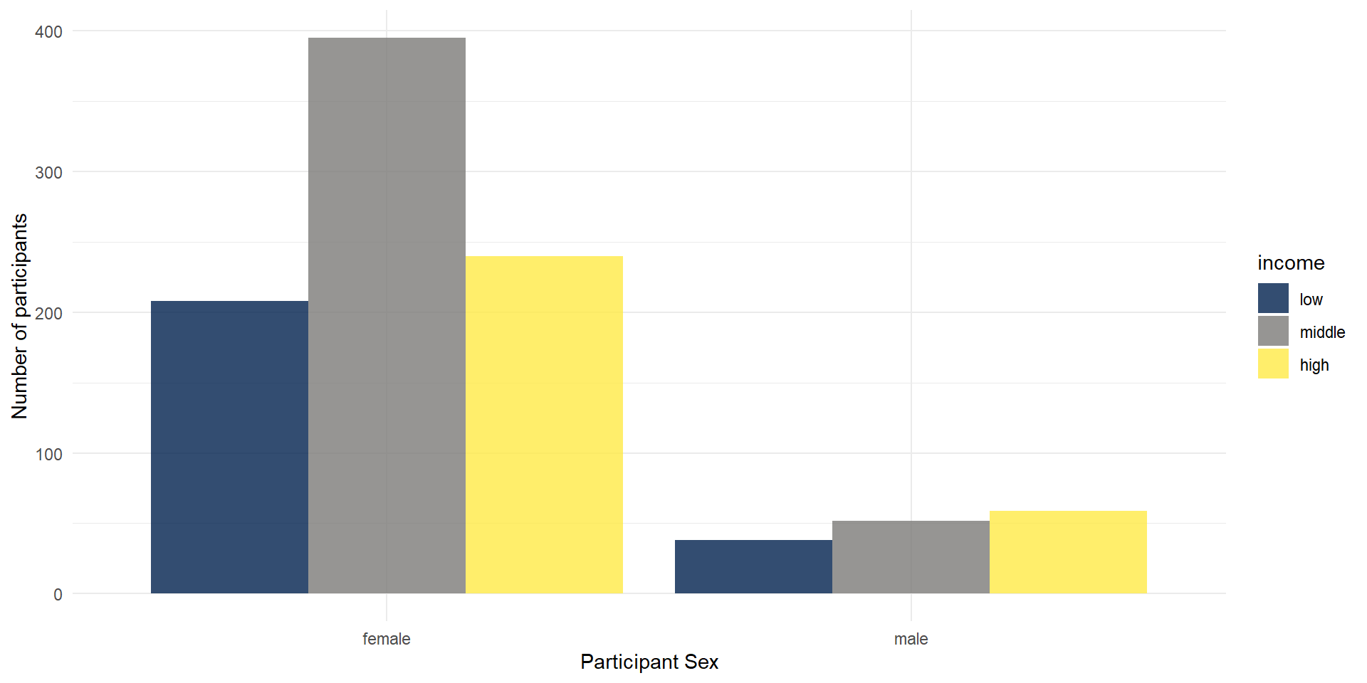 # summarydata3 %>% select(sex, educ, income) %>% summary()A bar plot is a plot that shows counts of categorical data (factors), where the height of each bar represents the count of that variable.