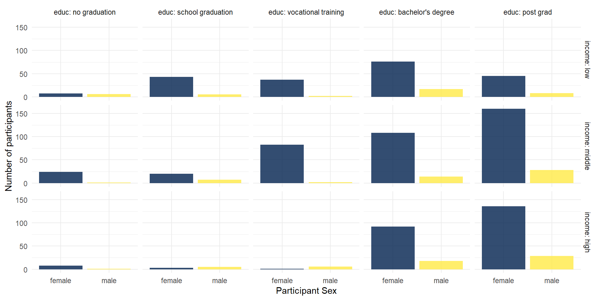 facet_wrap(vars(income)) # here, you need to use vars() around variable namesYou could also use facets to divide your data visualizations into several subplots: facet_grid for a matrix of (combinations of) two variables.