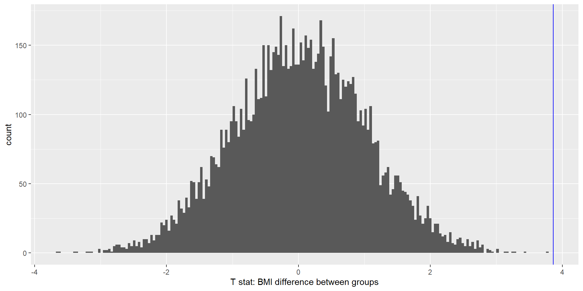 mean(meanDiffSimDf$meanDiffSim >= bmtTTest$statistic)The blue line is the observed t statistic. We can calculate a p-Value by counting how many of the simulated t-values are at least as extreme as our observed one and dividing it by the number of simulations. The p-value obtained from randomization (0.000000) is kind of similar to the one obtained using the t distribution (0.000075).