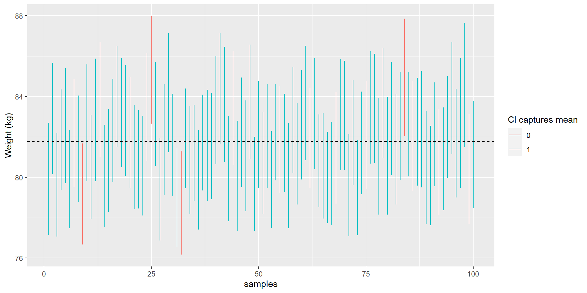 Let’s sample 100 times with \(n = 250\) from the NHANES data and calculate CIs. We use the NHANES mean as true score (dashed line) and check how often the CI misses to include it: 5% of the time.