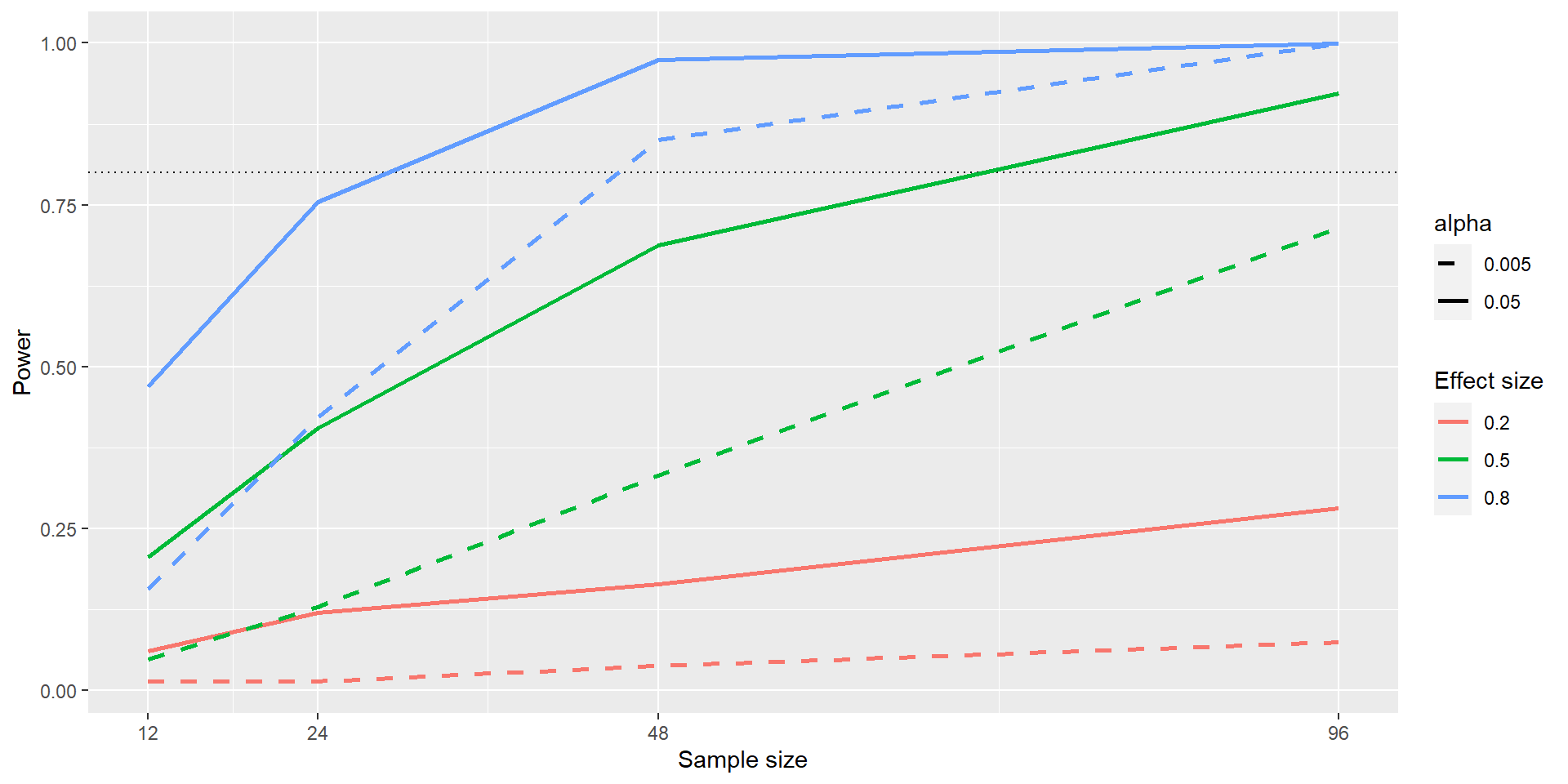 The black dotted line denotes the standard 80% power that is often aimed at.