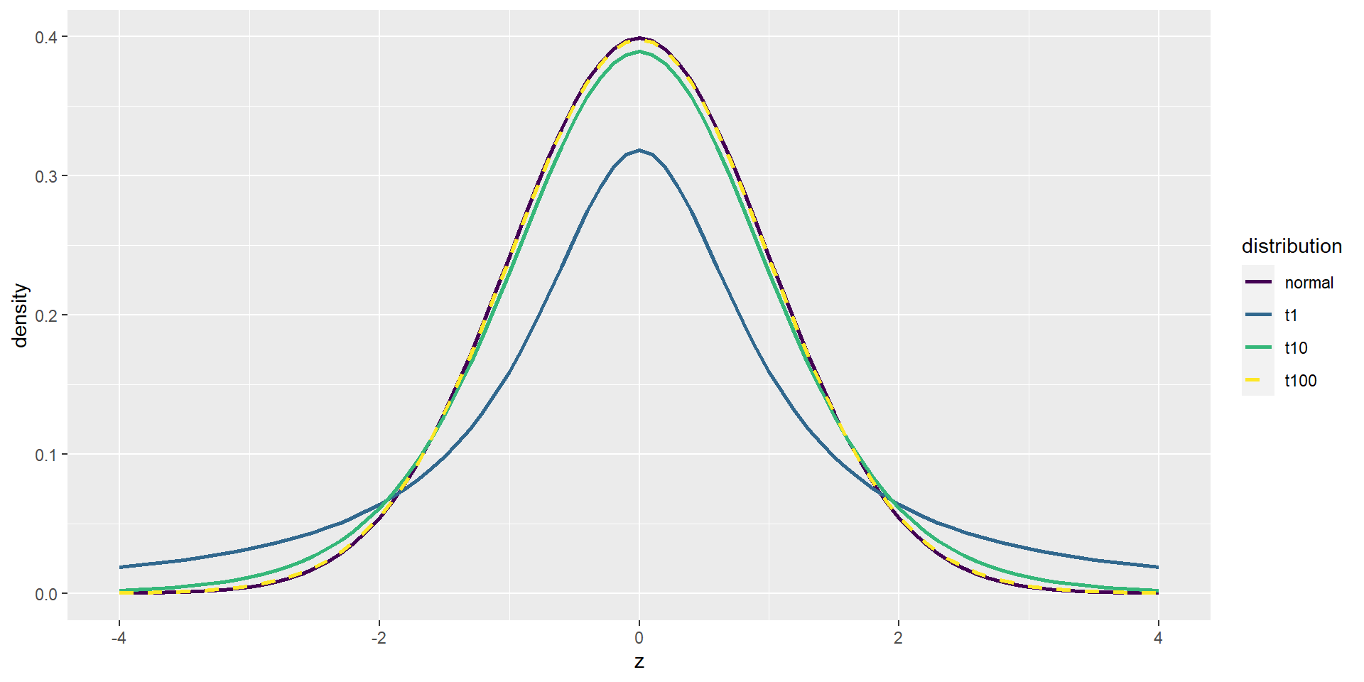 The CI for a t distribution is always larger than for a normal distribution. In practice, this difference is negligible at \(n \ge 30\) (1.984 vs. 1.960).