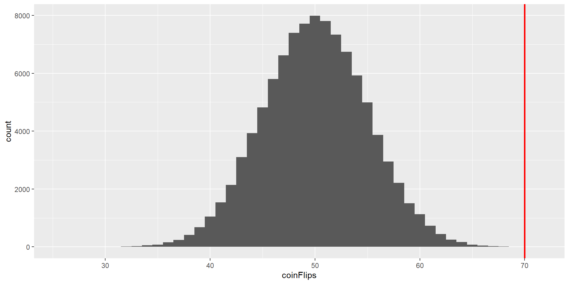 How likely is it that we would observe 70 or more heads if the coin is unbiased (chance of 50% for heads)?