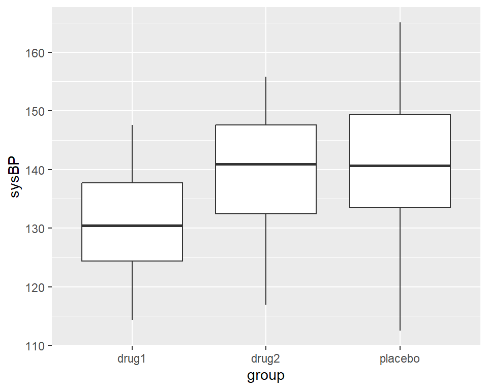 We can see a \(t\)-test for every drug against the placebo (remember we used fct_relevel for this). The \(t\)-tests show that drug1 (but not drug2) differs significantly from placebo.