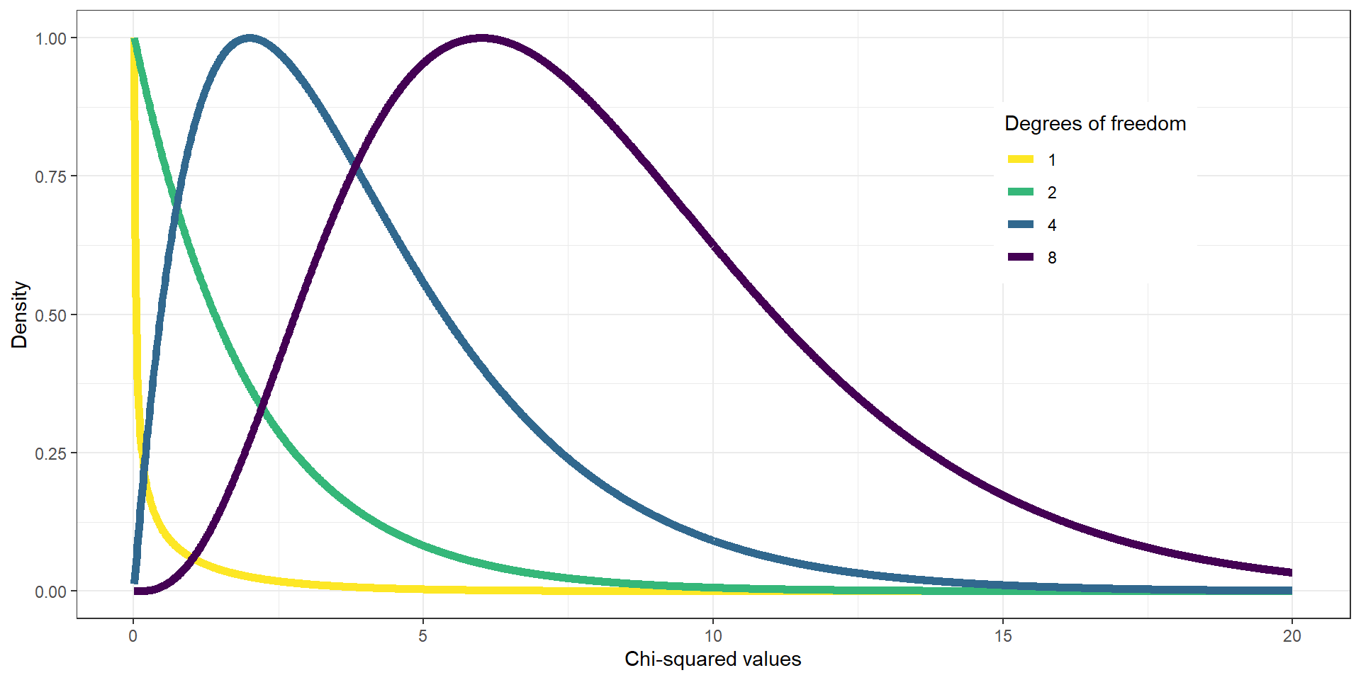 The shape of the \(\chi^2\) distribution depends on the degrees of freedom (much like the t distribution), which is the number of category levels \(k-1\).