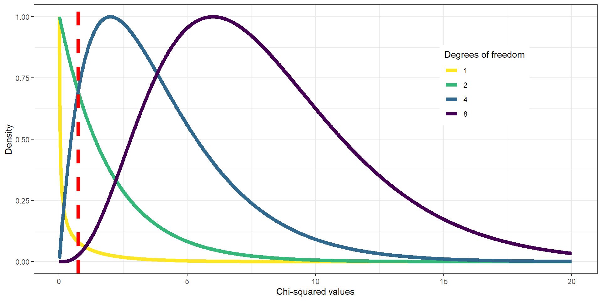 For the candy example, we use a chi-squared distribution with \(DFs = 2\) (3 candy categories minus one → green line). If we’d look at the distribution and found \(\chi^2 = .74\) on the x-axis (dashed red line), we would see that it does not fall far into the tail of the distribution but is rather in the middle. If we calculate the p-value, we’d get \(P(\chi^2 > .74) = 0.691\).