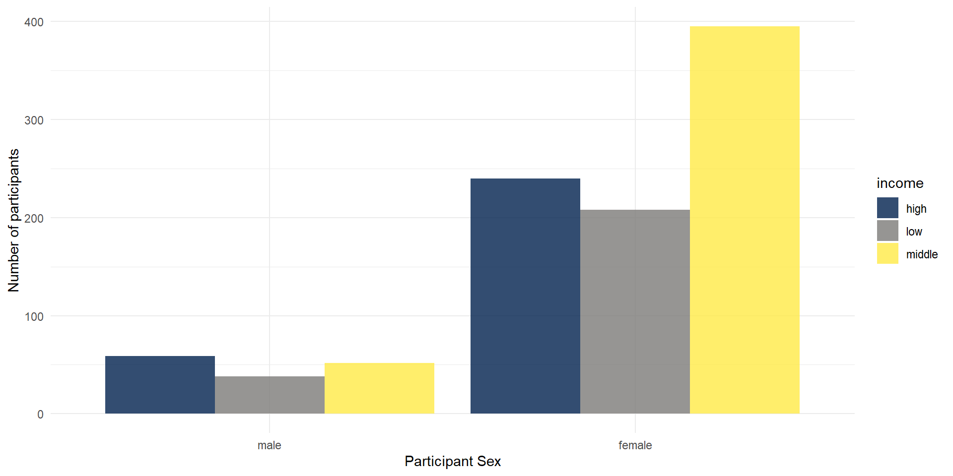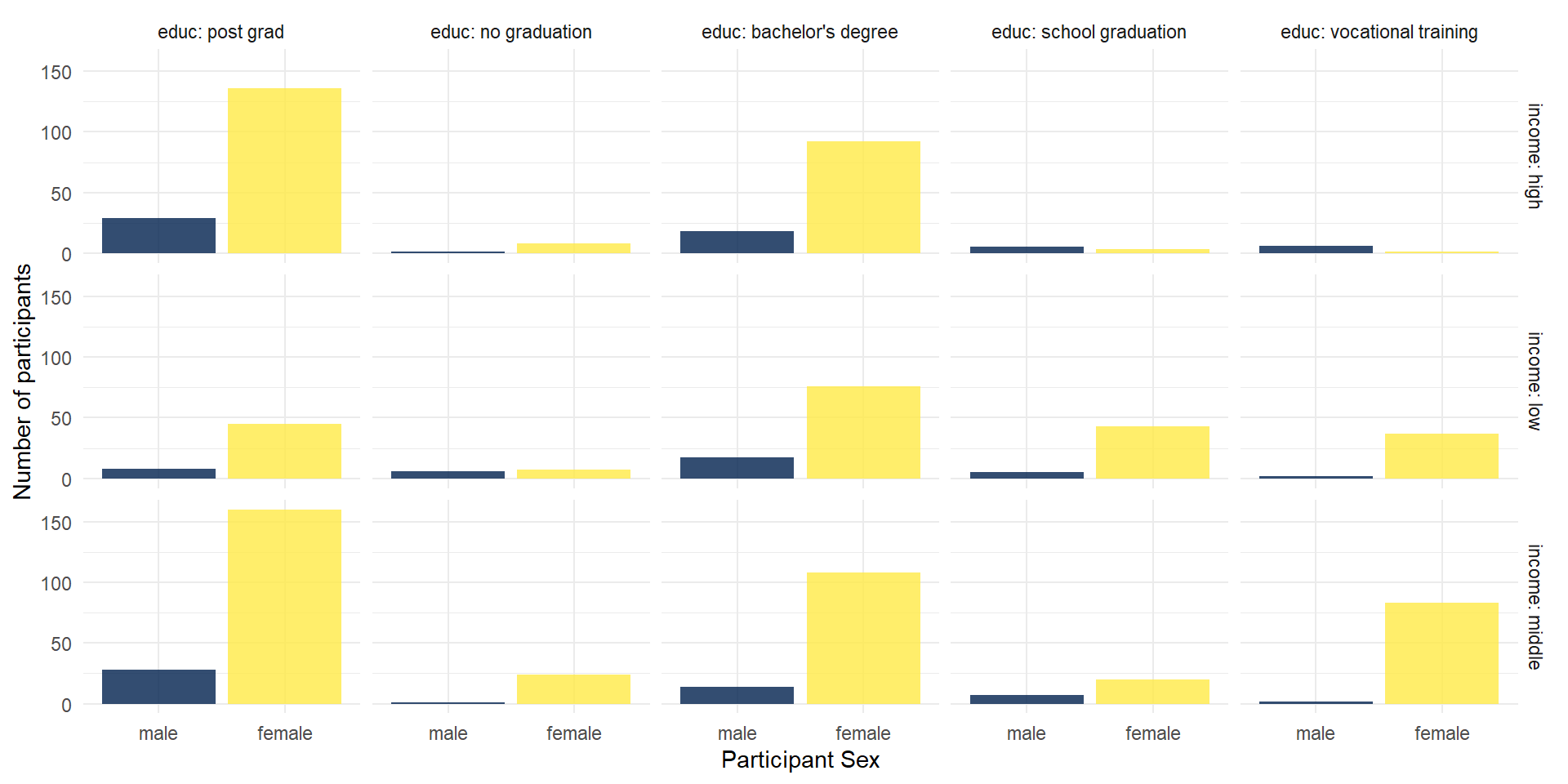 facet_wrap(vars(income)) # here, you need to use vars() around variable namesYou could also use facets to divide your data visualizations into several subplots: facet_grid for a matrix of (combinations of) two variables.
