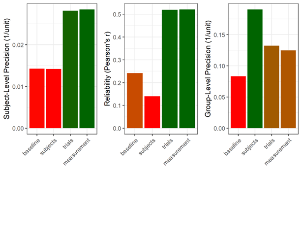 ⇒ When using trial-level data to calculate group-level precision, summarize twice!